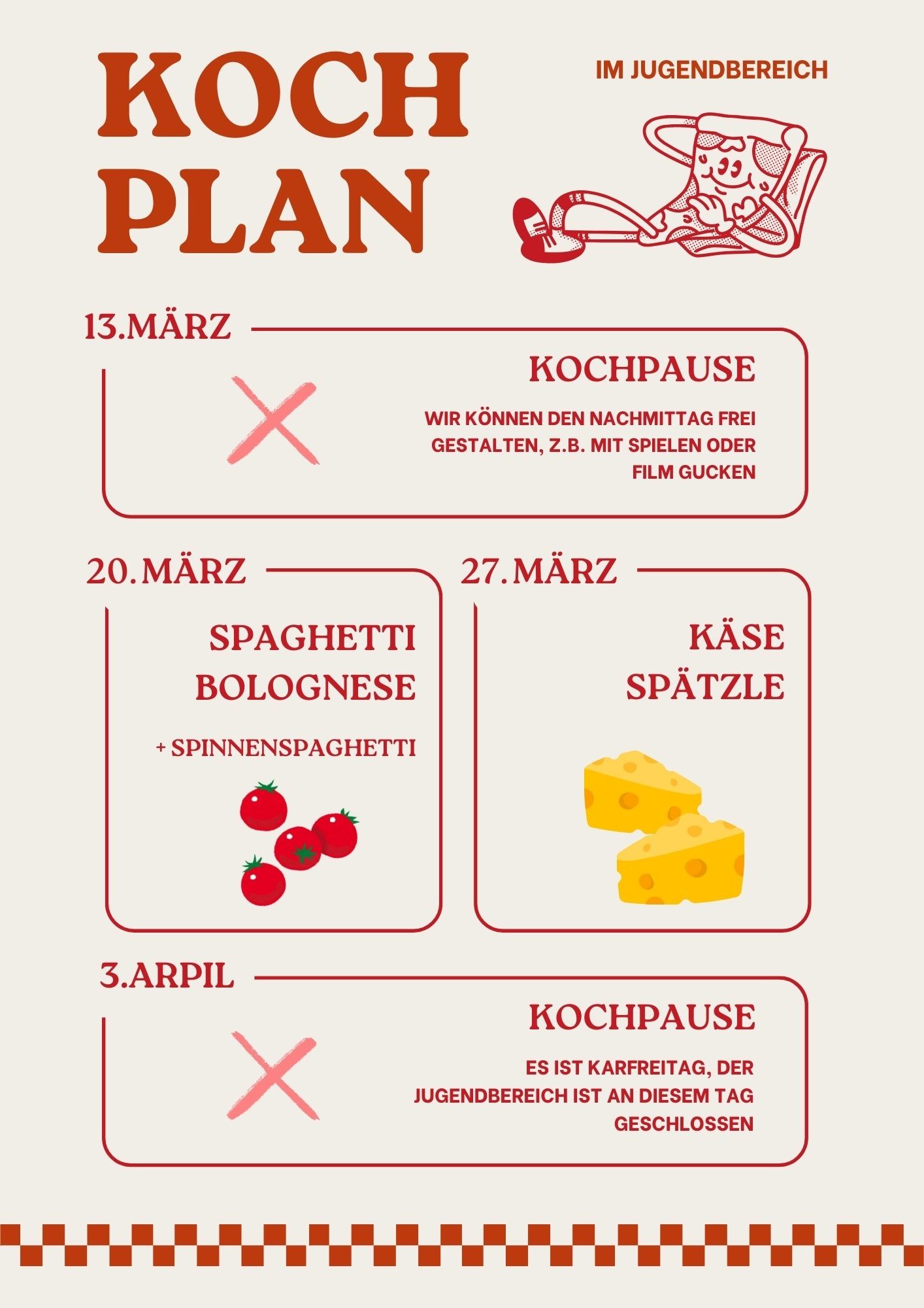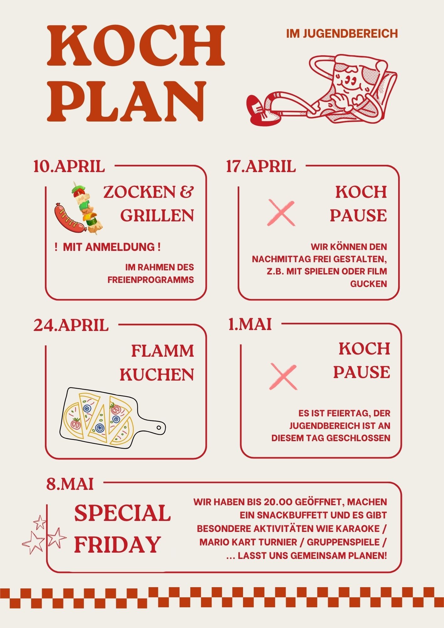 Lasst uns etwas tolles zusammen kochen! In der Regel kochen wir alle zwei Wochen. Unter Aktuelles finden ihr den Kochplan für die nächsten Wochen. Dieser wird anhand eurer Wünsche aus der Koch-Wunschbox im Jugendbereich erstellt.